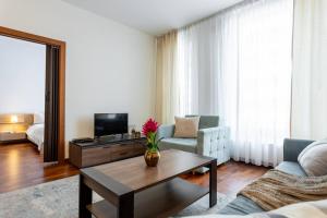 L’appartamento dispone di un soggiorno con TV a schermo piatto con canali via cavo, oltre a una cucina completamente attrezzata che include lavastoviglie e forno. L’area notte è caratterizzata da pavimenti in legno o parquet e presenta un divano letto. Il bagno è fornito di asciugacapelli e shampoo, sono inoltre disponibili asciugamani e biancheria. L’unità è insonorizzata per garantire la massima privacy.