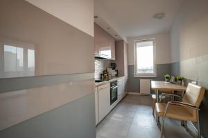 Des magasins comme Zabka et Bedronka sont juste dans l’immeuble. L’appart est dans un bâtiment neuf avec ascenseur. Il y a deux salles de bain et une cuisine bien équipée. L’arrivée se fait facilement avec des codes pour la porte. L’entrée est propre et moderne.